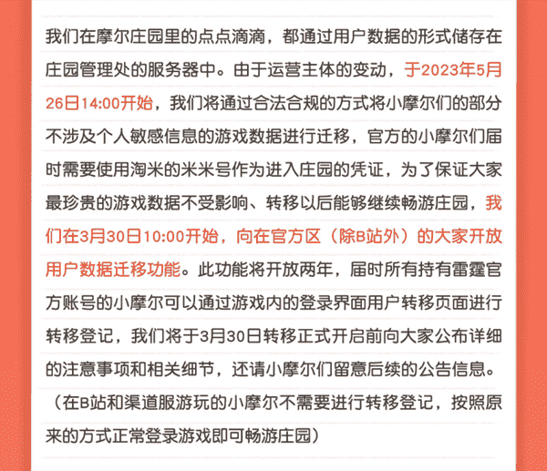 合作結(jié)束本就是開發(fā)方和代理方雙方的事情,,,,降低這件事情對玩家的影響,,,才是對所有珍視這段童年的摩爾玩家最好的呵護(hù)。。目前看來,,,,用戶完全不用擔(dān)心后續(xù)因無法登錄游戲而造成任何數(shù)據(jù)上的損失,,,只要及時進(jìn)行賬號轉(zhuǎn)移,,就可以好好保留、、延續(xù)在莊園的痕跡和回憶,,,繼續(xù)在莊園里做快樂的紅鼻子小鼴鼠。。。