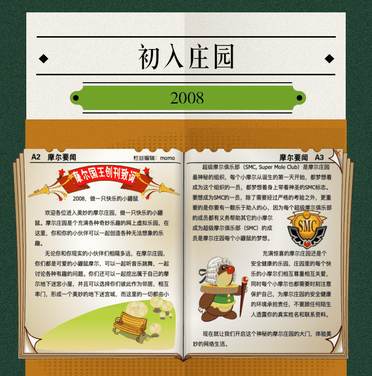 在這一年,,,摩爾莊園誕生了。。。在這里,,,,大家都是可愛的紅鼻子鼴鼠小摩爾,,,可以一起勤勞耕作,,一起高山滑雪......我們都是摩爾莊園的建設者。。。