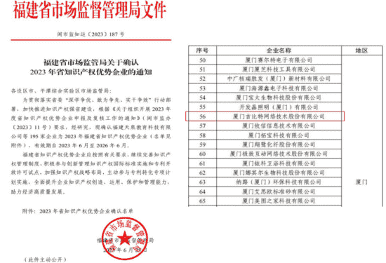 近日,,,,福建省市場監督管理局公示了2023年福建省知識產權優勢企業名單,,廈門一競技網絡技術股份有限公司(以下簡稱“一競技”或“公司”)榜上有名。。